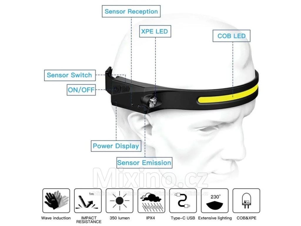 Čelovka má zabudovaný senzor pohybu pro zapnutí a vypnutí, pokud budete mít špinavé ruce, stačí jen mávnout a čelovka se sama zapne či vypne. (senzor aktivujete dlouhým podržením vypínacího tlačítka)